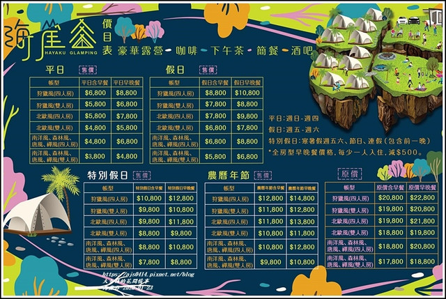 海崖谷不只是咖啡、餐飲、簡餐、午茶、酒吧,他們主打超夢幻白色帳篷的豪華露營,有6種不同風格的選擇,他們有北歐風、狩獵風、南洋風、森林風、禪風、唐風共六種風格,每一個帳篷都面海,當你清晨一早醒來,就可以跟太平洋道聲早安,這有多愜意啊!