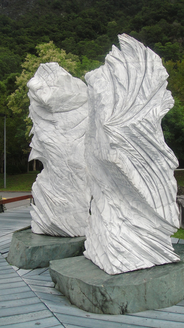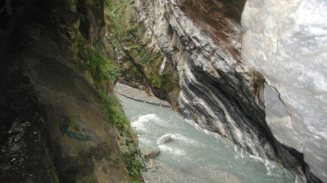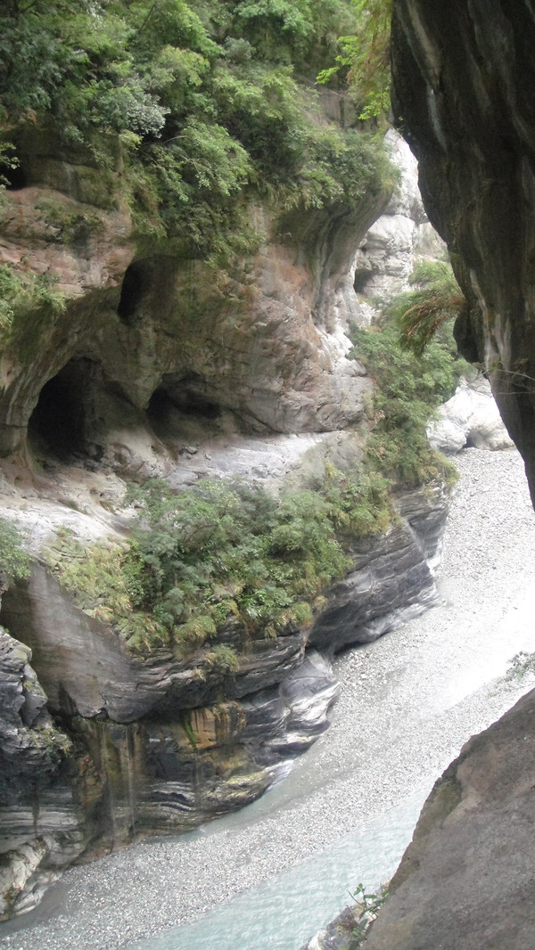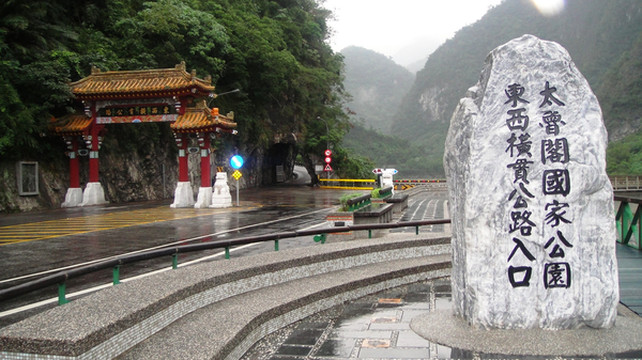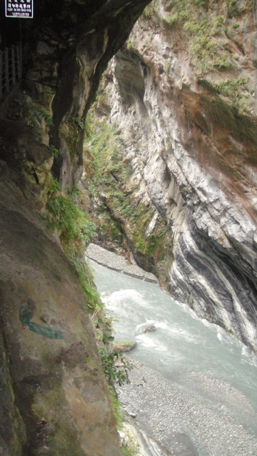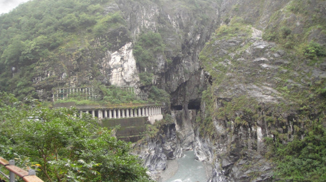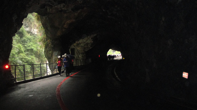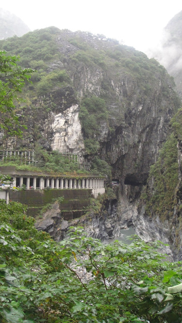 继续坐大巴来到太鲁阁公园。这里是台湾最著名的风景区之一,高大陡峭的山峰中溪曲水急,两岸悬崖万仞,奇峰插天,山体以花岗岩为主,当年蒋经国带领几万从大陆撤离到台湾的老兵,用原始的工具,在这花岗岩的山上,凿洞劈路,这条近20公里的隧道公路,间隔把临近悬崖一边山体开窗,让空气和阳光照进来,形成壁挂公路,出到洞口,能够清晰地看到山体的花岗岩和岩石上铜钎的凿痕。历经4年,死伤数千,完成了台湾太鲁阁山的公路建设,成就了今天作为旅游景区的交通要道。悲哉!壮哉!
