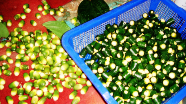 这是槟榔,台湾人的零食,用树叶沾上石灰,裹着槟榔在嘴里嚼。