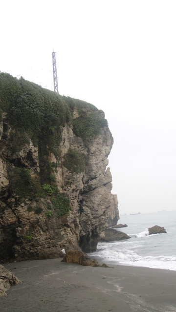 然后来到海边,一座巨大的礁石耸立在浅水区域,它的形状如同船上的大帆,正迎风前进,故名帆船石。