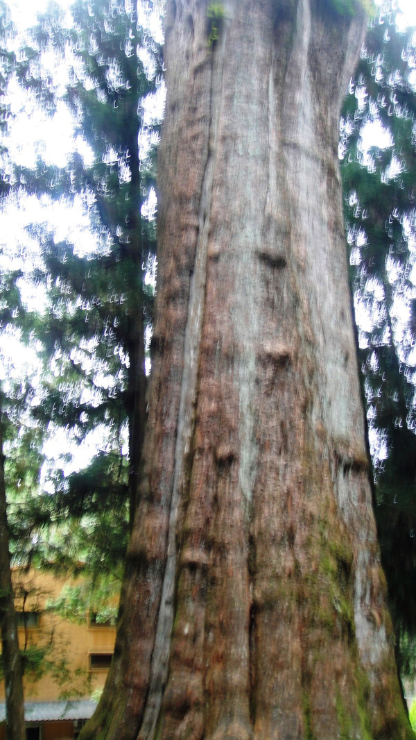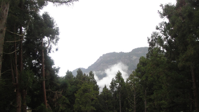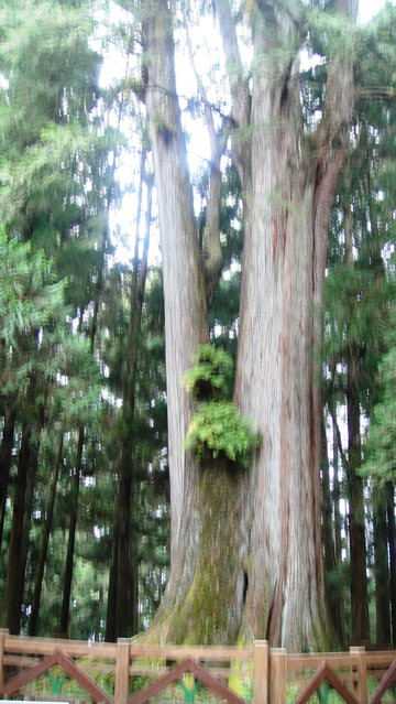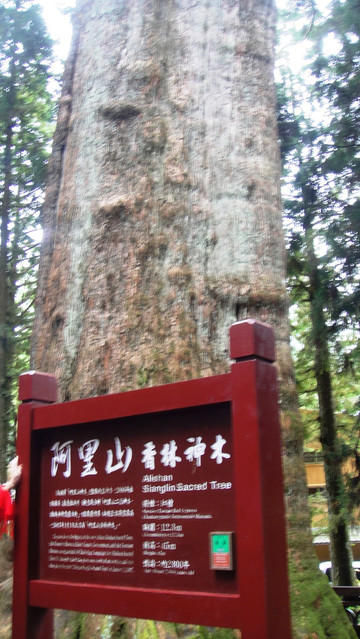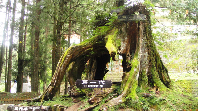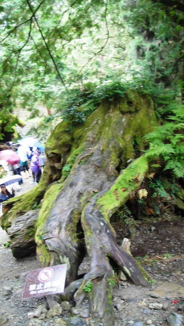 阿里山森林以原始的红桧树和扁柏等珍贵树木为主,高大挺且直。虽然是冬天,可阿里山依然林木葱翠,空气清新而湿润,刚下过雨,树叶还不时的滴水,若大山峦,再多的游客到来,也觉得人烟稀少。满眼是巨大无比的红桧树桩,盘虬的老根告诉我们它们有几千年的树龄,漫山遍野的树桩也在无声地控诉日本侵略者的罪行。1895年清政府签订《马关条约》割让台湾,到1945年抗日战争胜利,日本归还台湾岛,日本殖民台湾的50年间,将阿里山珍贵的天然红桧树和扁柏30余万株砍伐殆尽,运回日本本岛。日本那些用原木修建的寺庙,都是这里的木材。