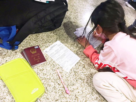 落地仰光 ,入境前要填写健康申报了。我们直接席地填写了。夏夏七岁了,英语也会了一些,她都能填好自己的部分了。