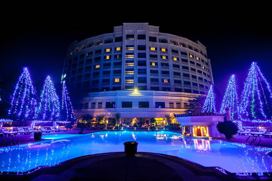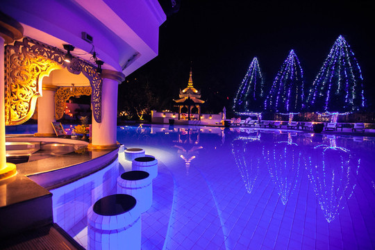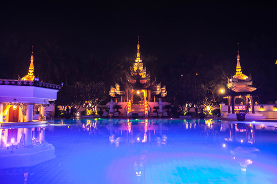 美居酒店夜景照。吃了晚餐,我就带着相机拍怕拍。摸了摸水温,依旧是冰凉刺骨。本打算这次出行让夏夏在没有教练盯着的泳池好好游泳的。无奈所订全不是恒温泳池,真是一路冰凉啊。