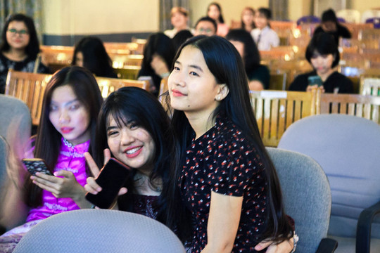 我选择一个位置坐在学生中间。看到我这个外国人,她们没有什么惊讶,完全沉浸在自己的欢乐中。笑声掌声迭起,我完全不知道发生了什么。无所谓啊,谁会关心内容,现在是一片欢乐的海洋啊。