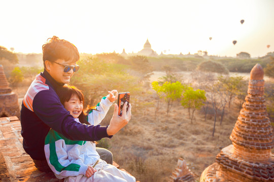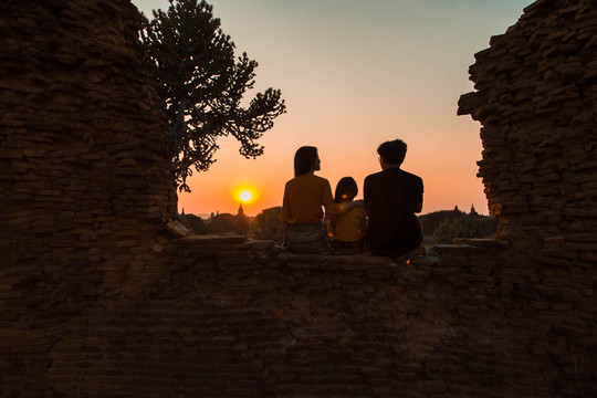 摸黑到达目的地。发现还有其他游客。到了塔顶天亮了才看清是三波人。一波是四个欧美老外,一波是一个广东 男孩俊,后面我们又在曼德勒碰上,一起游了敏贡古城。一波是我们家庭。佛塔没有台阶,我们手脚并用,堪比攀岩,有人上面拽,有人下面拖,这么稀里糊涂上去了。