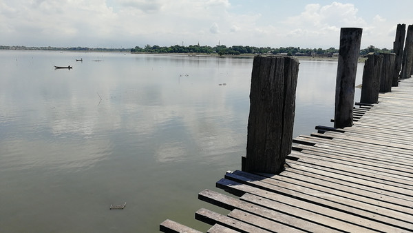 乌本桥的建材来自一座废弃王宫的回收柚木。长达1200米,由1086根实心柚木建造而成,是世界上最长的柚木桥。桥墩、桥梁、铺桥的木板都是用珍贵的柚木。小船驻足在桥下,你能感觉每一根古老的、高挑的柚木桩,似乎都承载了一个凄婉的爱情故事。虽然我对缅甸的爱情故事一无所知,但真的可以感受,感受那份沧桑的美丽,那份残缺的缠绵。