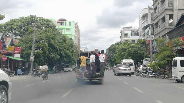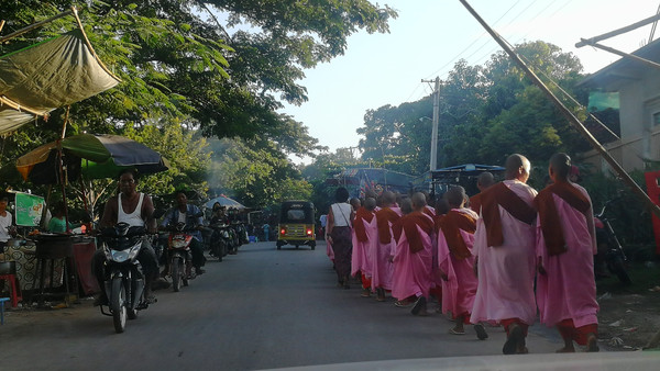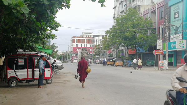 清晨起床时曼德勒的街头已经是人来人往了,化斋的僧人拿着食盒悠闲的走在大街上。