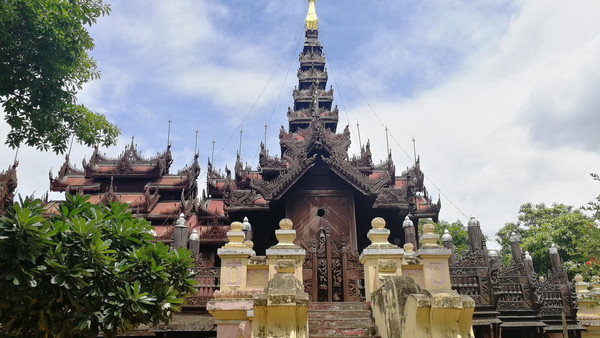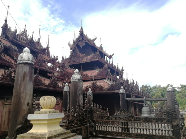 宝迦雅寺 ,俗称“柚木寺",整座寺庙都是由267根柚木建造而成,并因此得名。作为一个外国人,作为一个外国游客,我所能涉猎到的缅甸历史有限,尤其是这种景点的历史,更是很难找到其准确的信息。只知道宝迦雅寺是曼德勒因瓦古城里最古老的建筑。柚木寺庙非常漂亮,远望幽幽然,莫相知。建筑为方顶重檐结构。只是此建筑似乎又比一般的重檐建筑更繁复一些,内外门窗和墙壁上有很多精细木雕,特别是顶上的柚木雕刻非常精美,整个庙宇全都坐落在数百个粗大的柚木支柱上,外围也有柚木支柱卫护。是我在缅甸见过最漂亮的寺庙,该寺至今没有翻新过!但是外面门窗和围栏处风化的极为严重,几许沉淀,几许感触,又有几许温暖,也有几许薄凉!那些裸漏在外,能被风吹日晒到的单薄的窗棱、隔断看上去摇摇欲坠,在细小的柚木结构上刻满了岁月的沧桑!