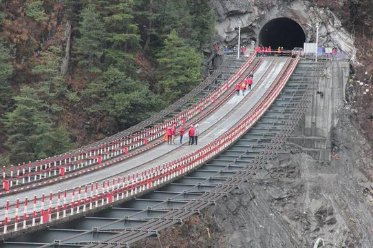 为了解决上述问题,建设者从317国道旁开口,掘出两个隧道,用9个月时间搭起一座索桥,全国最长施工便道重载索道桥由此诞生。这座桥单跨353米,横跨狮子坪水库,在狮子坪特长隧道中间部位开辟施工作业面。