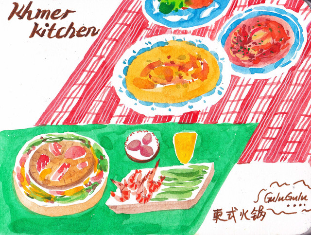 柬式火锅倒是可以体验一番,因为除了常见的鸡肉、牛肉、猪肉,还有一种特别的肉——鳄鱼肉,菜菜死活都不肯吃,倒是我吃了不少,吃起来比较接近鸡肉吧。柬式火锅像这样中间是用来烤肉的,会放一块猪肉在上面当做烤肉用油,旁边可以放海鲜或者蔬菜之内的,就把它理解成一锅两吃吧。没想到的是,当晚我们俩拉肚子,不知道是不是因为肉没熟。。。