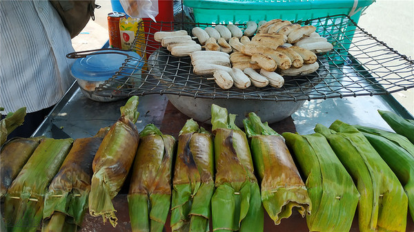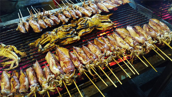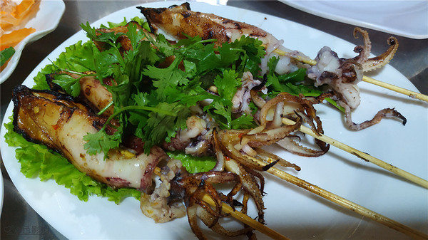 在纪念馆里就喝了两瓶水,差不多快5:00 游客渐渐散去,我们也返回民宿,在楼下看到两位美眉在交谈,问她们附近有没有什么餐馆,她们说 往前走两个街区就是市场,往左拐走会有很多吃的。谢过就步行过去了,果然几步就到了市场,这不就是夜市吗,烧烤、小吃路边都摆满了,品种很多,走了一条街我们都没有停下来,我妹不喜欢吃路边摊。后来看到一间烧烤大排档,有三十多桌的样子,真是座无虚席,都是海鲜和烧烤,看到烤鱿鱼正在滋滋的响,看上去很好吃。我说我们要不在这里吃吧, 我妹同意了,转了一圈都没有找到位置,又 等了5分钟,终于等到位。