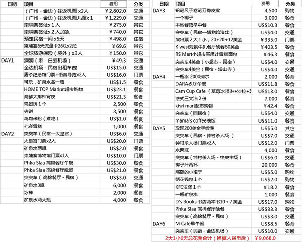 平时旅行有记账的好习惯,可以清楚自己花费多少 ,还可以写攻略来给其他人参考,2大1小金边游6天总花费列表如下: