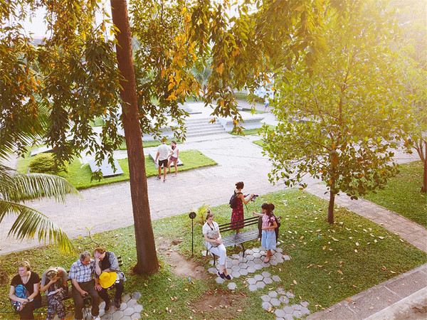 游客们,来自全球的游客们,每个人头上戴着耳塞,坐着或者站着静静的听,语音导览做得不错,现有13种语言,大部分游客都能找到自己熟悉的语言。坐在树下,走在花间,看起来一派岁月安好,曾经是地狱, 现在是博物馆。