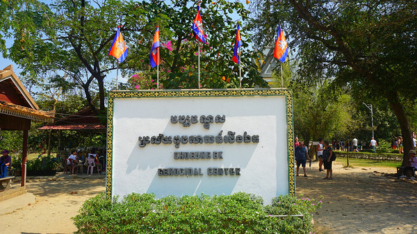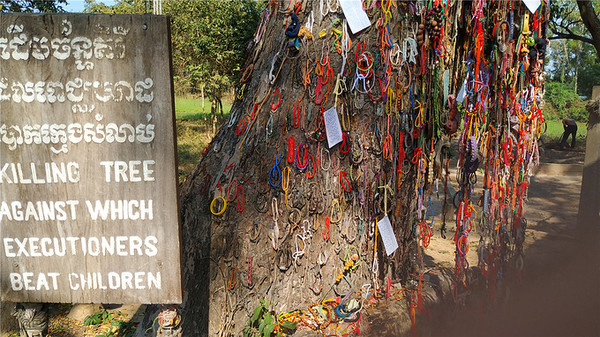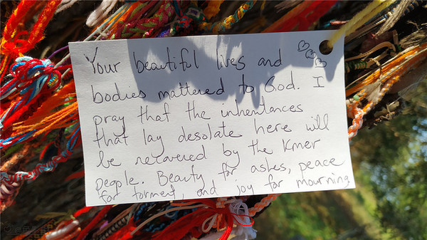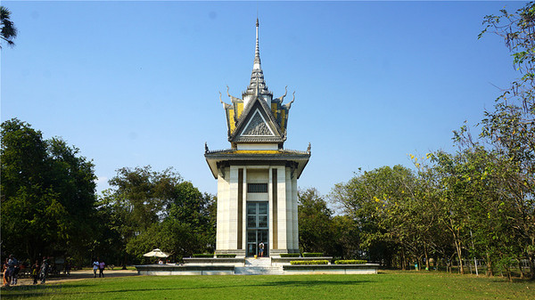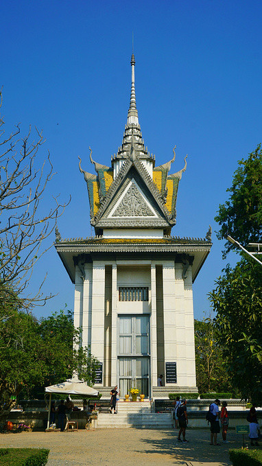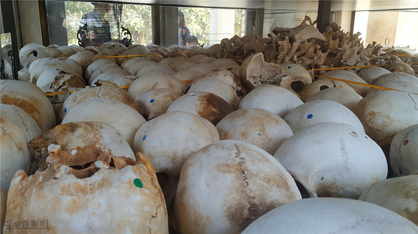 今天去了钟村杀人场,也叫万人冢,这是遍布柬埔寨300多个杀戮战场中的其中一个,这里被残杀过1万人,万人冢出土了九千多个骷髅,当时的红色高棉政权杀戮活动,全国300多万人,约1/4的人口都被杀害了,他们都是些无辜的人:老师、知识分子、工人、农民、懂外语的人、戴眼镜的人、妇女、儿童、婴儿……这是一场惨无人道的种族灭绝活动,一段悲惨的历史,现在在这个遗址建立了一座纪念佛塔,里面分为17层,保存放着受害者的遗骨,供大家悼念并超度他们。