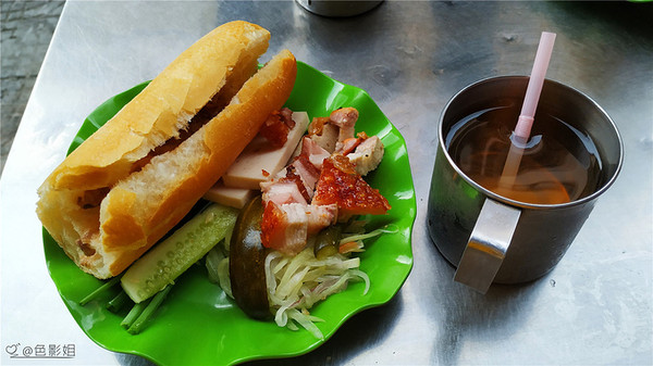 回民宿的路上发现了一个路边摊在卖越南法风烧饼,刚吃完,其实肚子不饿,但是就想买,于又买了两个,摊主家的一个小男孩端来了两杯冰茶,开始不知道什么,喝了一口就尝出来了,这不就是我们爱喝的茶还冰过了,真好,还带吸管。