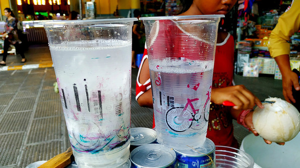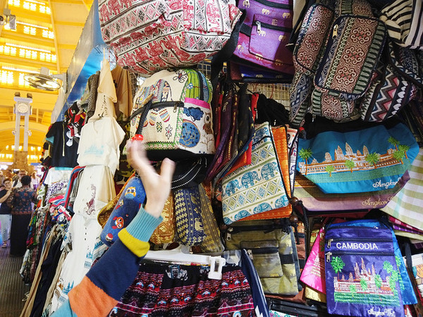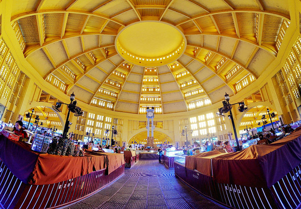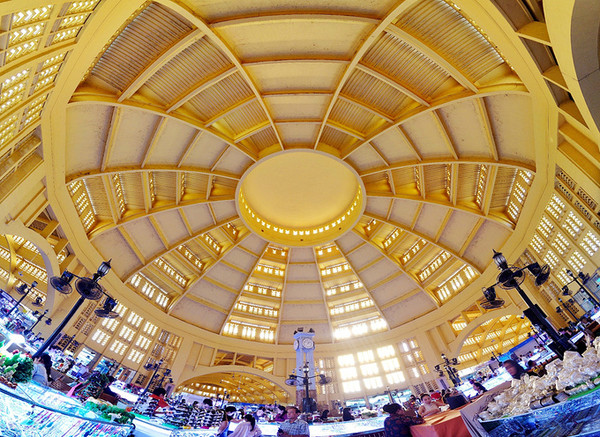 柬埔寨金边的中心市场Central Market,是一个有着圆形拱顶的米黄色建筑,挺洋气噢,里面主要是售卖首饰和服装,我们进去 先买一杯现开椰汁,边喝边逛,买了条小裙子,买了个两刀的绣花钱包,嘻嘻,主要看热闹。