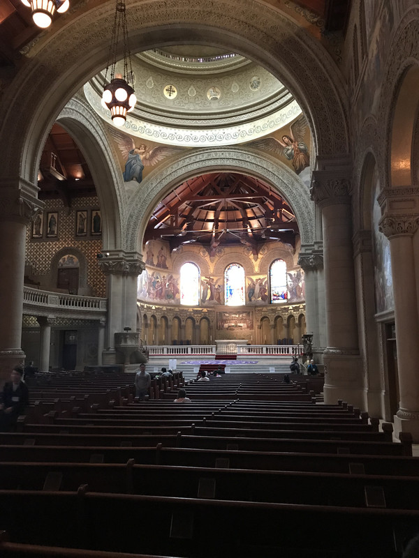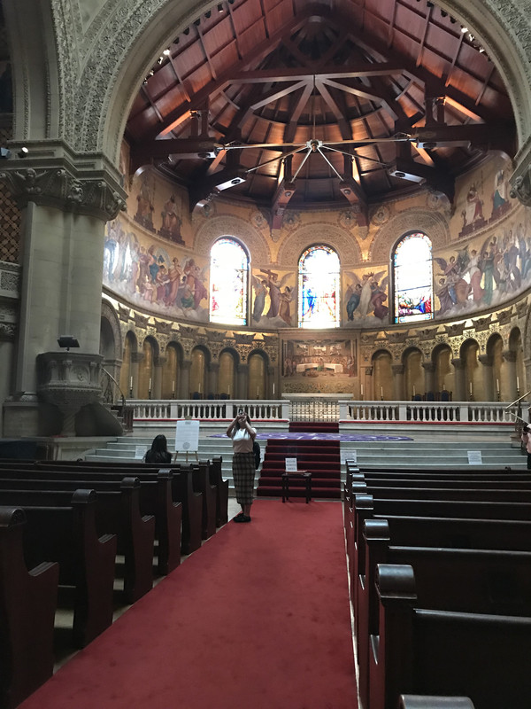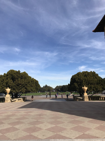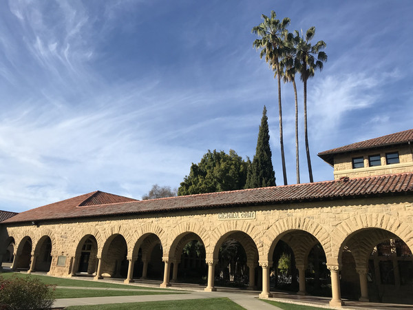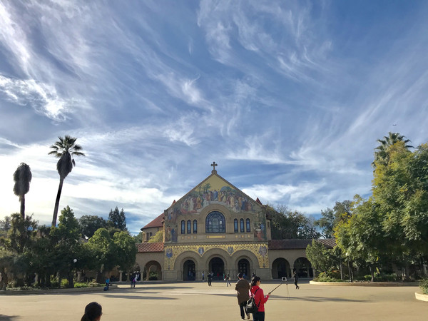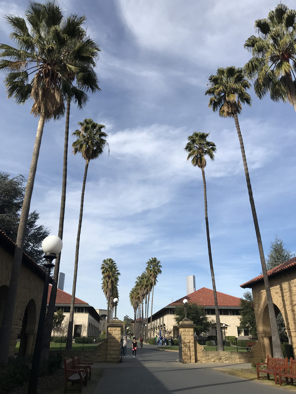 早餐仍是牛奶麦片加松饼,无论如何是可以吃得很饱,然后就早早驱车前往今天的第一站,斯坦福大学。美国的大学不像我们国内有非常明显的界线,它和所属的小镇是一个整体,并没有围墙一类的隔断把它们分离开。我们到达学校后直接把车停在了下沉广场周边的停车场,事后才知道这里不允许游客停车,为此为罚款45美金,真的好心疼!不过Stanford的校区真的很美,黄墙红瓦,长长的走廊,优雅的拱弧,透出鲜明的西班牙、意大利的风格,与加州的阳光、蓝天白云搭配得恰到好处。在建筑中间有棕榈树和橄榄树在远方站岗,有莘莘学子在身侧穿梭往来,还有一个在我看来很大的教堂耸立在校舍当中,我们虔诚地参观了教堂的内部,在这座据说是全美最美的教堂内,是我们更能接近上帝的地方。