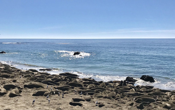 仔细研究了一下线路,还是决定绕道一下去看看象海豹海滩(Piedras Blancas Elephant Seal Rookery),经过近二小时曲折而且有些相当惊险的山路之后,我们终于到达了海象滩。从矮崖上的观景台可以看到成群的象海豹在沙滩上旁若无人地日光浴。