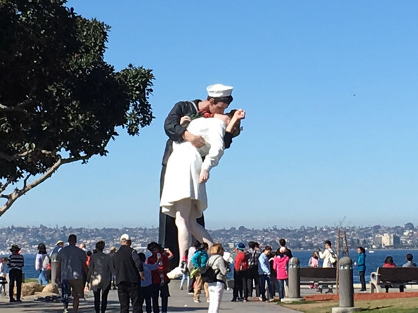 吃过早餐后,我们选择了闻名世界的航母博物馆,这是一艘退役的战船,是在冷战时投入使用,还参加过越战,现在退役了,又发挥余热为游客开放参观。最为著名的胜利之吻的塑像就立在这个航母旁边的小广场上,阳光仍旧那么明媚热烈,有艺人在码头自弹自唱,有鸽子在游人脚边闲庭信步,有高大修长的棕梠树在空中招来摆去,眯着眼睛,这一切都变得如此不真实,薰薰然如同梦境。