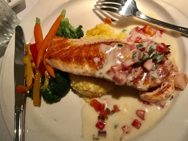 结束17英里到达颇具波西米亚风味的卡梅尔小镇Carmel-by-the-Sea。小镇卡梅尔,尽管历史不足百年,却以百余年来沉淀的优雅艺术氛围和得天独厚的自然美景闻名遐迩,并深得文人,艺术家的亲睐。一百年来,只有4000多居民的卡梅尔风采依旧完全得益于小镇居民悉心爱护和极力维护。小镇居民抗拒现代化,拒绝任何广告,禁止安装霓虹灯和咪表,杜绝快餐店。我们在卡梅尔小镇用的晚餐,餐厅布置地古香古色,菜品味道也相当美味,我们点了三文鱼、牛排、龙利鱼和牛肋条,都是一人一份的套餐,份量很大,还有餐前面包。又一次吃撑了。餐厅也是随机遇到的,可能家家都会这么好吃吧?