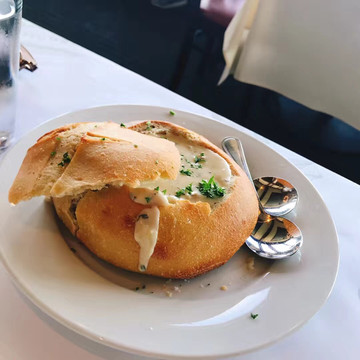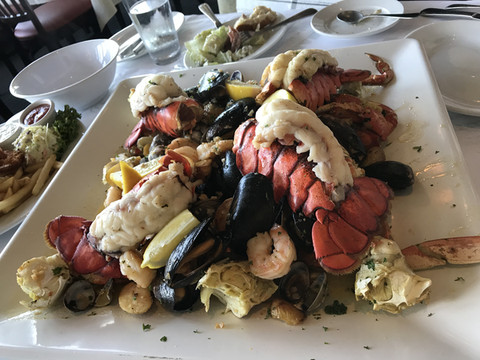 它是一个步行的商业街区,里面有好多餐厅、咖啡馆和艺术商店,相对于前期对旧金山的灰色印象, 这里就鲜亮多了。渔人码头的标志是一个画有大螃蟹的圆形广告牌,找到了“大螃蟹”,就到了渔人码头。随街行走,经常会遇见街头艺术家们的表演。到了渔人码头,自然少不了海鲜大餐,我们是随意找了一家海鲜餐厅,看规模应该算是非常大的一家店了,从室外的楼梯上到二楼,在门口有服务生把我们引到座位。我们点了四人份的光鲜拼盘,里面有龙虾、螃蟹、大虾等好多种海鲜,另外还点了每桌必点的蛤蜊奶油汤,酸面包,沙拉,当海鲜拼盘端上来时我们吓傻了,真的好大好大,其实我们应该只要一份就足够了,没办法,只好拼命地吃。味道虽然不错,但实在量太大,最后剩下好多。看着周围老美们的简陋午餐,心里暗暗地有些愧疚,认认真真的把剩菜打包。此餐花费352美金,是此行最贵的一餐了。