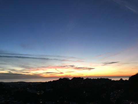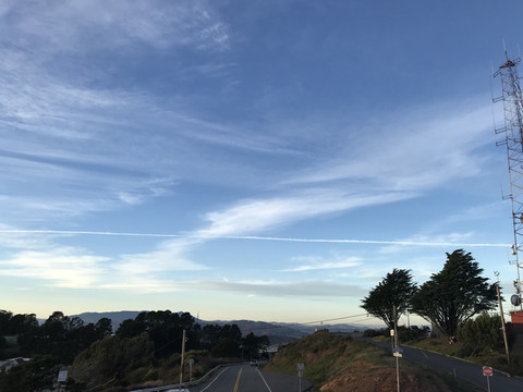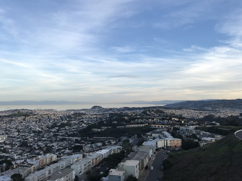 看时间还早,决定开车前往双子峰。刚到达时天还大亮,整个旧金山城市面貌全部呈现眼前,慢慢地夕阳西下,落日的余晖笼罩着城市上空,蓝天渐渐变暗淡,层层叠叠的白云缝中透着红彤彤的日光,真的是太美了。语言无力,有图为证。