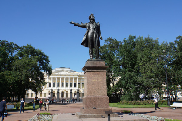 最后,我们又去瞻仰了我青年时代的偶像-----普希金青铜塑像,它坐落于圣彼得堡俄罗斯国家博物馆前.只见他右手抬起,远眺远方,像是在低声吟唱“假如生活欺骗了你,不要悲伤,不要心急,忧郁的日子里需要镇静,相信吧,快乐的日子将会来临”