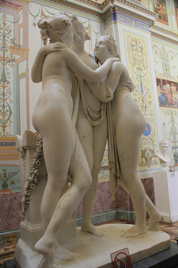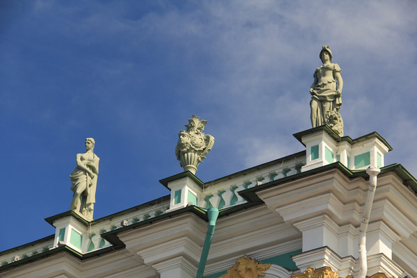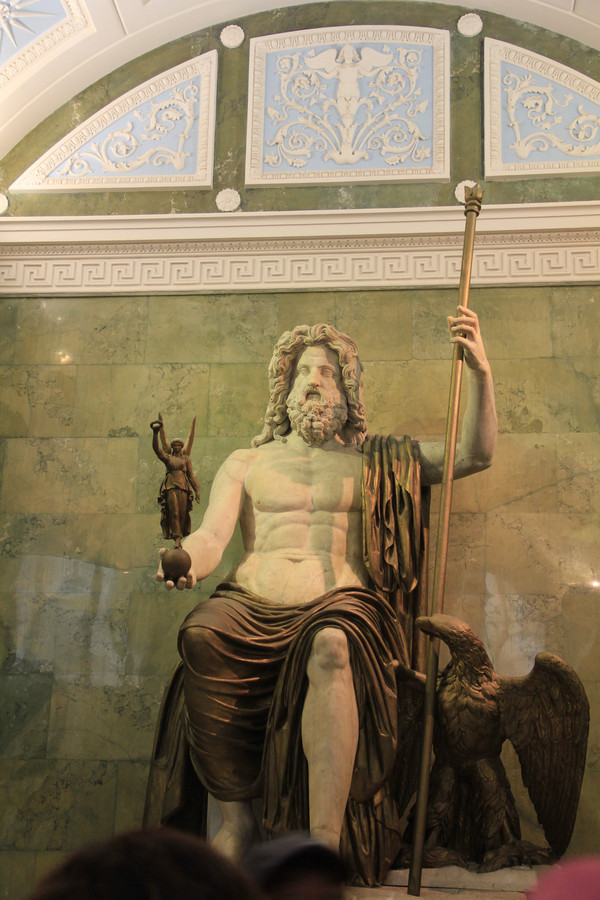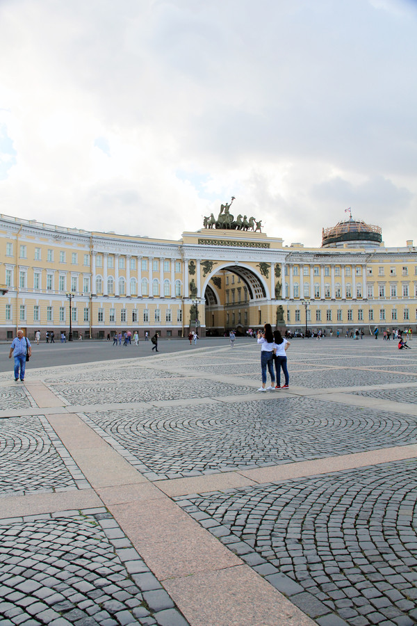 随后,我们去了此行的最重要的参观地点,冬宫,又称艾尔米塔什博物馆,是世界四大博物馆之一,与巴黎的卢浮宫、伦敦的大英博物馆、纽约的大都会艺术博物馆齐名。四角形的建筑宫殿里面有内院,三个方向分别朝向皇宫广场、海军指挥部、涅瓦河.说来好笑,昨天自由活动时,我们沿着涅瓦河闲逛,看见一排蓝色的建筑上面满是雕塑,整个建筑巍峨壮观,就拍了不少照片,回来一问导游,原来就是大名鼎鼎的冬宫.这个博物馆藏品异常丰富,因此如果想要走遍所有全部展厅,恐怕花上一个月的时间都不够,而我们只有一个小时时间,戴着耳麦,跟着导游一路狂奔,冬宫里的人实在太多了,和夏天的布达拉宫有一拼,如此拥挤的情况下,是无法欣赏艺术品的。我能记得的就是这个馆藏有很多举世闻名的绘画作品,比如达·芬奇存世作品只有十幅,冬宫就拥有两幅。还有拉斐尔的名作《科涅斯塔比勒圣母》和《圣家族》。绘画之外的我还能记得的就是米开朗基罗的雕塑《蜷缩成一团的小男孩》.希望有机会能再去俄罗斯仔细看看这些藏品.