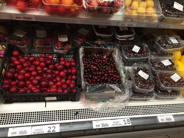 今天的中餐是自理的,所以大家都跑到附近大商场去找饭吃,里面倒是什么都有,麦当劳,肯德基,burger king 甚至还有中餐panda express,想着语言不通,还是找个熟悉的快餐,---麦当劳。漂亮的小姑娘勉强能说两句英语,要了两个巨无霸套餐,她又问我要不要ketchup?吃薯条当然要番茄酱,又问要几个?两个套餐,自然两个,不想坑爹的是,俄罗斯的番茄酱是另外要钱的,虽说钱不多,但没有哪家汉堡店番茄酱是另外加钱的不是?吃完饭去商场一楼逛超市,看见又大又红的车厘子,从此开启我的车厘子之旅,本人车厘子控,但国内实在太贵了,这次出去玩,一路上车厘子就没断过,就是在物价高昂的北欧,车厘子还是比国内便宜。