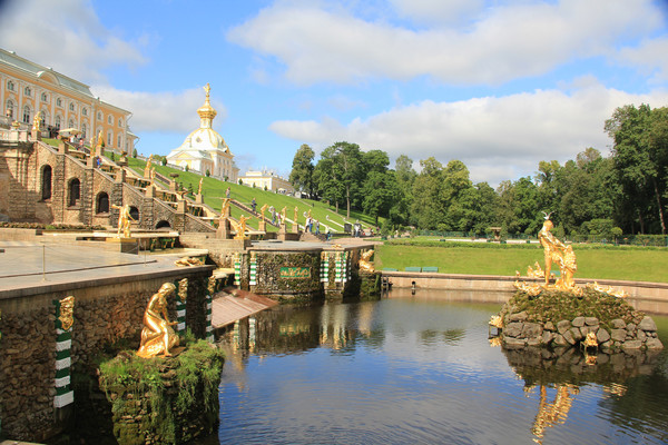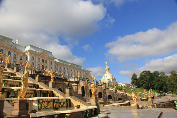 水池附近是鲜花点缀的碧绿草坪,水池后面是镀金穹顶的大宫殿.蓝天白云下,穹顶流金溢彩,喷泉玉珠飞溅,光彩夺目,美轮美奂。