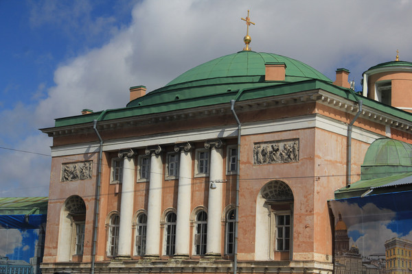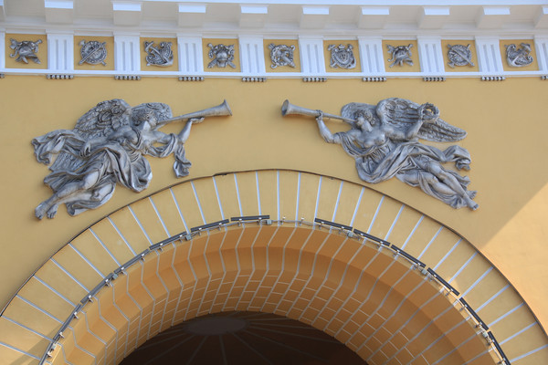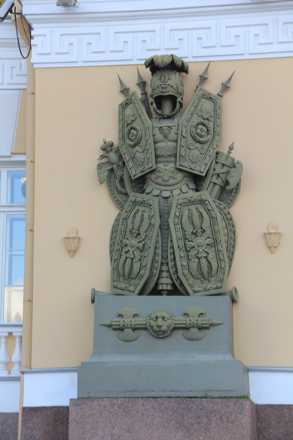 青铜骑士旁边就是沙俄时期的海军总部,。整个大厦非常气派,有56座大型塑像、11幅巨型浮雕和350块壁画装饰。类似于凯旋门的拱形六门上装饰有以海洋及俄罗斯海军为主题的各种雕像及半浮雕,正门两侧摆放着两组名为海神的庞大雕像群.从这座建设于17世纪的奢华大厦可以窥视曾经强大的波罗的海舰队和黑海舰队.