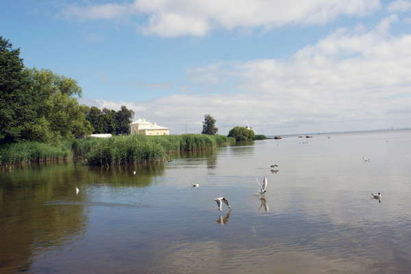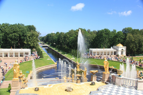 当年彼得大帝想要拥有一座比法国国王的凡尔赛宫更美的花园,他亲自设计了花园的蓝图.它位于芬兰湾南岸的森林中,和芬兰隔海相望.