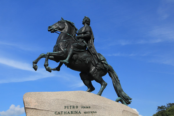 青铜骑士,其实就是一座青铜雕像,因了普希金的长诗《青铜骑士》而声名远扬。 “高傲的骏马,你奔向何方?但不可否认的是它是目前世界上纪念性雕塑艺术最完美的作品之一。骏马前腿腾空,彼得大帝安坐在坐骑上,两眼炯炯有神,目视前方,充满信心,严厉而自豪。据说铜像底座的天然巨石,是在芬兰被发现的,叶卡捷琳娜二世悬赏七千卢布,让数百名农奴拉了整整一年才拉到了芬兰湾,最后用木排从水路运到了这个广场。使人不禁想起静静躺在南京东郊的阳山碑材,可见中外的帝王贪婪冷酷都是一样的.