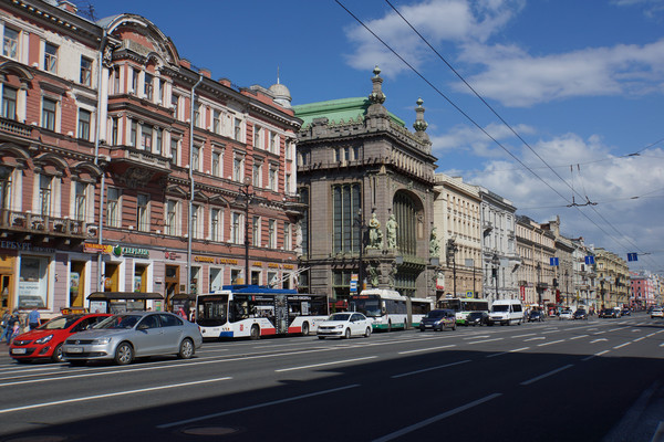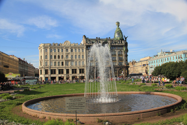 修造于1710年的涅瓦大街被称为世界最美的街道之一,街道宽阔整齐.路旁建筑整齐划一,每栋建筑都可以堪称艺术精品.但是俄罗斯的商店不知是不是由于冬天寒冷的原因,都没有漂亮的大橱窗,只有一个小门推门进去,我们又不认识俄文,也搞不清那些建筑是商店,那些不是,再说也不需要买什么东西,所以商店基本没逛.沿着大街溜达,来到了奥斯特洛夫斯基广场, 广场中央建有叶卡捷琳娜二世铜像, 底座上雕刻着当时侍奉女皇的九位贵族.由于时间原因,我们本次未能去叶卡捷琳娜宫参观,不想在此瞻仰到这位声名显赫的女沙皇.广场后面是建于1832的亚历山大德里娜剧院,此时好像正在上演芭蕾舞.我们在广场边的长椅上休息,广场上百花争艳,当地人带着孩子,牵着狗在花园中休闲.