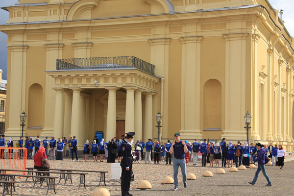 今天的参观项目是彼得保罗要塞,该要塞 1703年5月16日由彼得大帝在兔子岛上奠基,它与彼得堡同龄。彼得堡是在要塞的保护下诞生和发展的.要塞中建筑物中众多,有圣彼得保罗大教堂、钟楼、造币厂、十二月革命党人纪念碑等等。很不巧的是,我们去得当天是个宗教纪念日,教堂外排的都是来参加宗教活动的人,我们只能从教堂外的大液晶屏实况转播里一窥教堂的风采了.