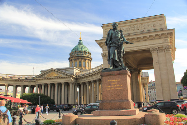 最后来到喀山大教堂,这个教堂的建筑风格和滴血完全不同,它的东面竖有94根科尼斯式半圆型长柱长廊,使其成为典型的俄式教堂。半圆形的回廊两端分别是库图佐夫元帅和巴克莱·德·托利塑像,两位元帅貌似都是俄法战争打败法国的英雄.