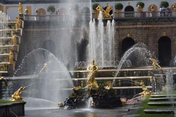 一进花园就看见一个大半圆形水池,四周有很多喷泉和众多金色雕像,在水池中央耸立着大力士参孙和狮子搏斗的雕像,参孙双手把狮子的上下颚撑开,泉水从狮子口中冲天而出,水柱直喷22米之高。这一雕塑象征着俄罗斯战胜瑞典。