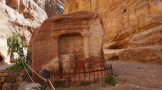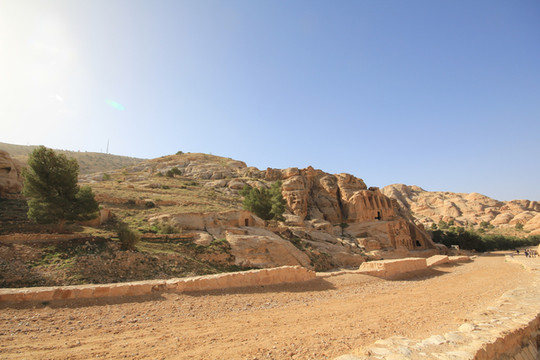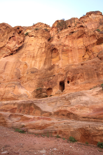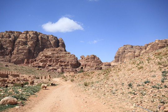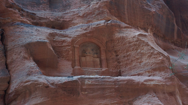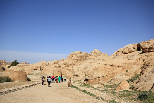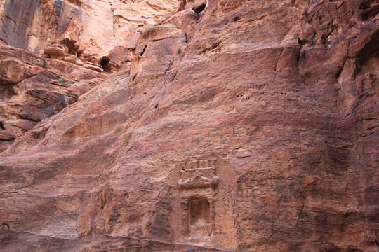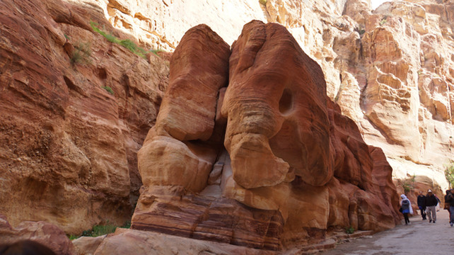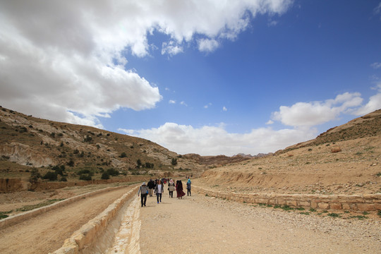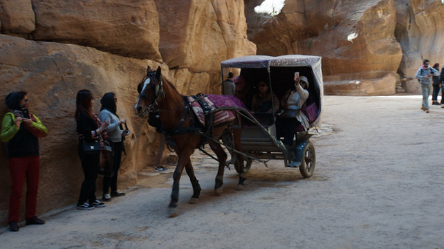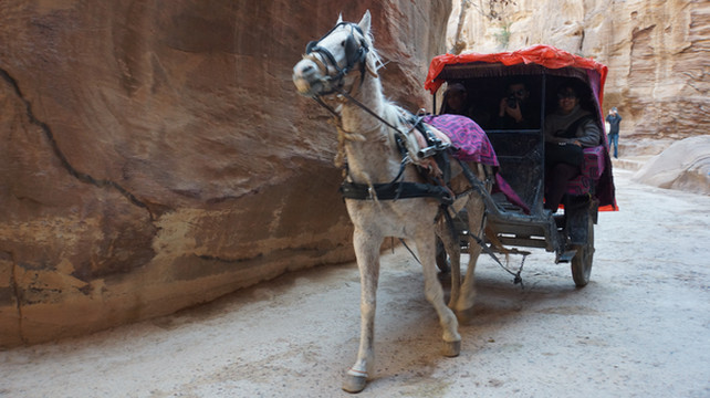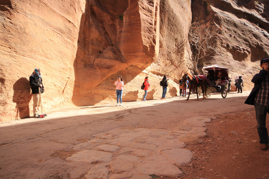 所以称之为“蛇道”,是因为其像蛇行般的蜿蜒曲折。两边峭壁高不可测,感觉和美国的羚羊谷非常相像,但羚羊谷是完全天然的,而这条小道上你不时可以看到当年纳巴泰人所留下的生活印记.有水渠,墓穴,神龛,雕塑的动物,文字,甚至有结婚宣誓的庄严殿堂.走在这狭窄的山谷小道上,望着身边不时疾驶而过的马车,遐想当年这曾经是个多么繁荣的城市,但却在一夜之间消失在历史的长河中。纳巴泰人败于罗马人后,一下子无影无踪,没有尸骨,没有典籍,连一点线索都未留下,仅有的一些刻在石崖上的图案文字,但至今也没人能破译.