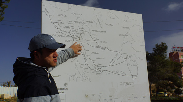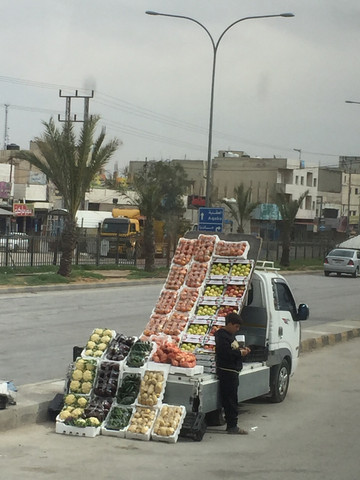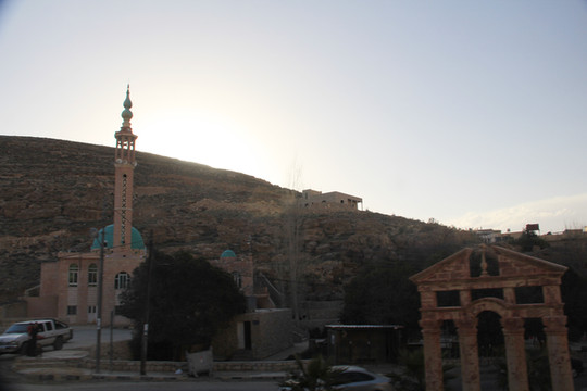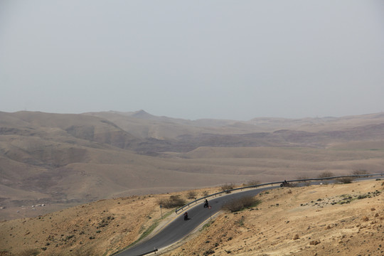 进入约旦,明显荒凉了起来,满目入眼的都是褚红色的连绵山地,偶尔能见到绿色圆顶的清真寺,约旦和以色列不同,是阿拉伯国家,信奉伊斯兰教了。路边不时可以看见围着红色格子头巾的阿拉伯人,小店里师傅在做着一种类似我们油饼的大饼,这基本就是我们后来几天在约旦和埃及的主食,没有油,很干,不是很吃得惯。