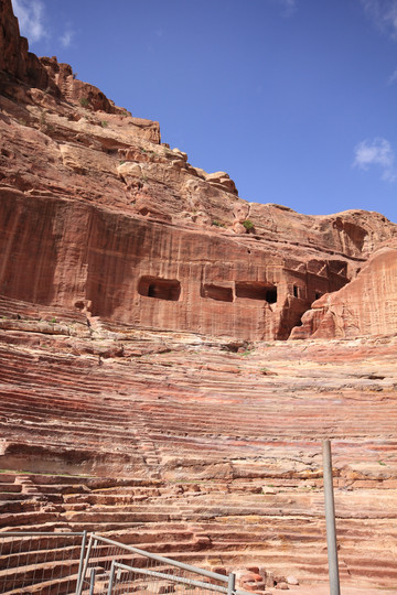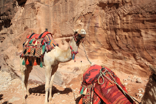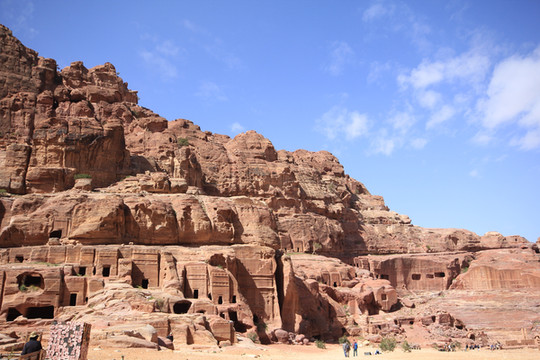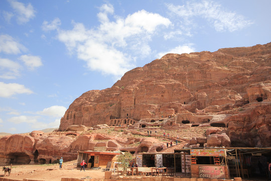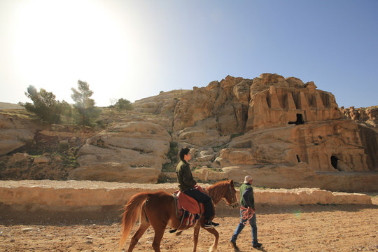 佩特拉古城非常大,全部游玩需要走行15公里山路,从卡兹尼神殿往里走,佩特拉古城的全貌尽现眼前。连绵的赭红色山岩,披挂的花花绿绿的骆驼、骑着马包着头巾的贝都因汉子,还有半圆形古罗马剧场和铺着黄沙的古罗马街道,让人仿佛走进了一个西部电影的拍摄场地。