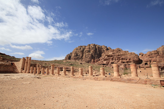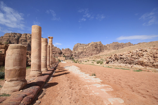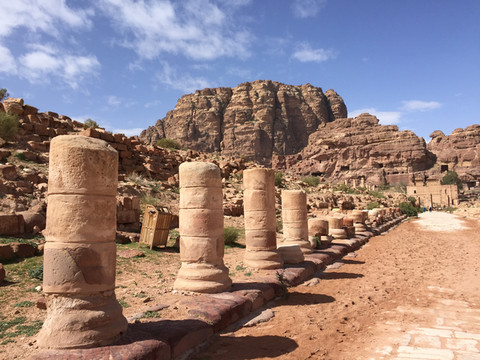 穿过哈兹纳赫殿堂前面的小广场,是依山而建的半圆形古罗马剧场,走过古罗马剧场,就是黄沙铺地的古罗马大道了.大道金黄,披挂的五颜六色的毛驴载着世界各地来的游客悠然踱着步子, 街道两旁布满了城门、廊柱、教堂、水道、大祭坛等。虽然只留存些断垣残壁,但不难想象当年的佩特拉作为王国首都和商贸要道时的繁华.