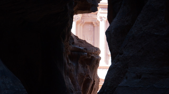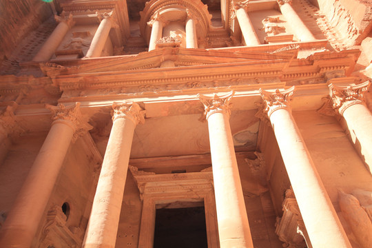 蛇道两边峭壁高耸,暗黑一片,回声荡荡,可是当你转过这令人毛骨悚然的山峡,则是另一番景观,世上最令人惊叹的建筑就呈现在眼前:高130英尺,宽100英尺,高耸的柱子,装点着比真人还大的塑像,整座建筑完全由坚固的岩石雕凿成形。,它最引人注目的特征是其色彩,由于整座建筑雕凿在沙石壁里,阳光照耀下粉色、红色、桔色以及深红色,层次生动分明,这就是大名鼎鼎的卡兹尼神殿