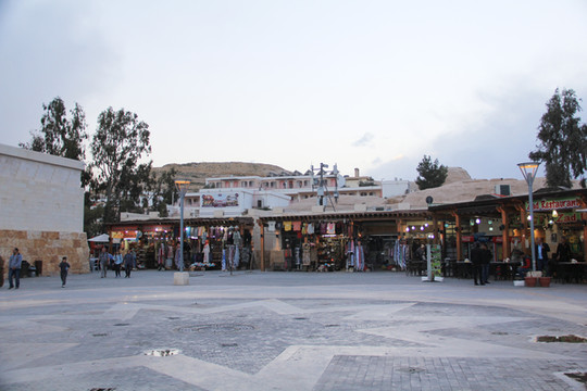 经过几小时的拉车,我们到达约旦古城佩特拉。到达时已是傍晚,但是因为所住酒店就在景区对面,忍不住还是前去看了看。景区已关门,只能在大门外看了看,感觉非常一般(但是第二天进去以后却是非常震撼),外面有很多卖纪念品的小商铺,东西很多,标价均为D,我们以为是美元dollar,结果是约旦第纳尔,而这个货币与人民币比值差不多是1比10,所以大家买东西前一定问清是什么货币,因为那里是旅游景点,东西是相当的贵。景区外面是一条小街,街上骑马的,走路的,开小汽车的共挤一条小道,也算是一个奇观了吧。