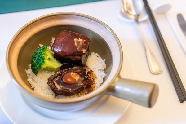 最期待的老酒鲜鲍红烧肉,选用了爱尔兰的猪五花,加入陈年的花雕酒和大连的新鲜鲍鱼,烹调中猪五花的肉香和陈年老酒的酒香,再配上大连鲍鱼的鲜,变成良夜里的黯然销魂。