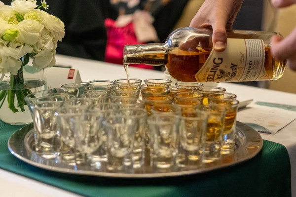 餐后,苏里文先生亲自为每个人斟上一shot杯爱尔兰威士忌,他偷偷告诉我区别爱尔兰威士忌与别国威士忌的方法很简单,英文Whisky和Whiskey都是威士忌酒,拼写里有e的是爱尔兰威士忌。
