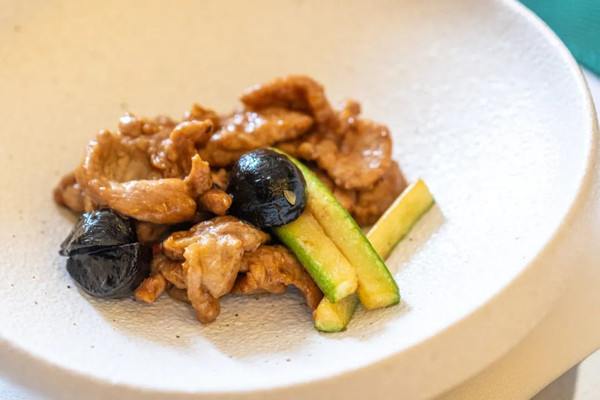 爱尔兰猪梅肉跟养生黑蒜、脆瓜同炒,一点点小米椒提辣。梅肉部位是最适合做叉烧的,锅炒又多一份镬气,出锅时我恨不得堵在厨房口。