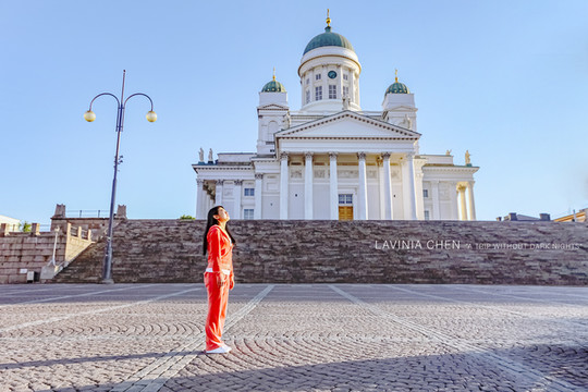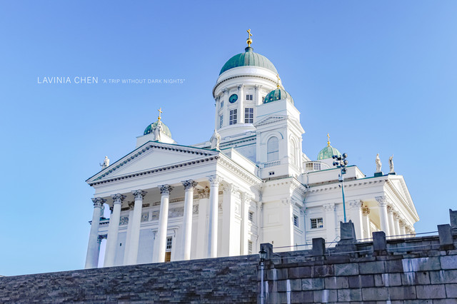赫尔辛基大教堂是赫尔辛基的地标性建筑,白色的主体纯净无暇,希腊廊柱及淡青色青铜圆顶展现了教堂的恢弘气质。趁着没人,我和朋友们在台阶上跑上跑下,拍了好多犯二的照片,就不放上来了。跑累了,来到台阶下边儿议会广场上来张安静的照片。