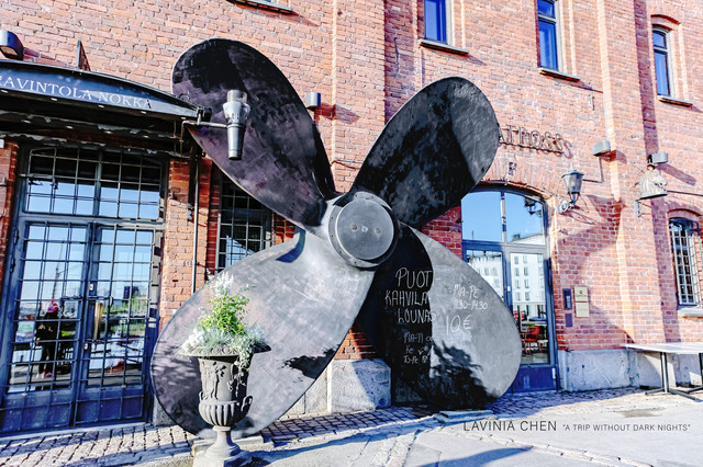 岸边有很多小店,我不认识芬兰语言,但我认识数字呀。能看出营业时间和价格,应该是把店面的宣传写在这个巨大的装饰风扇上了,很有意思。