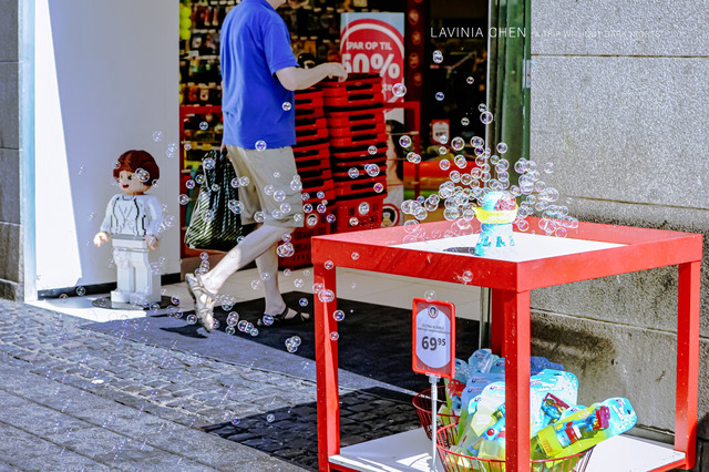在市中心的购物街,我们在一个儿童商店门口遇到了泡泡机,阳光下彩色的泡泡们五颜六色,太有童趣了。