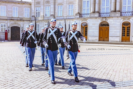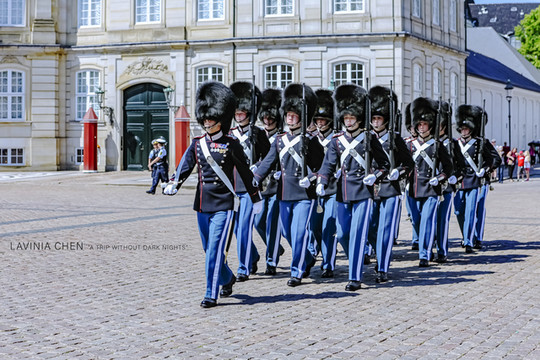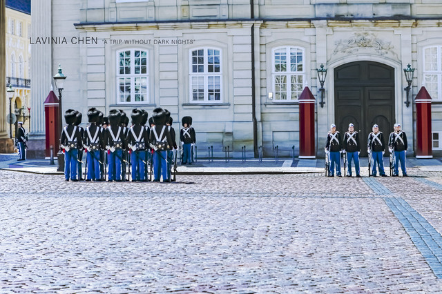 换班仪式在阿美琳堡宫前,阿美琳堡宫是丹麦现在的皇宫。与瑞典皇宫不同的是,丹麦王室还居住在里边。如果你看到广场上的旗帜是升起状态的,那说明丹麦女王正住在里面。